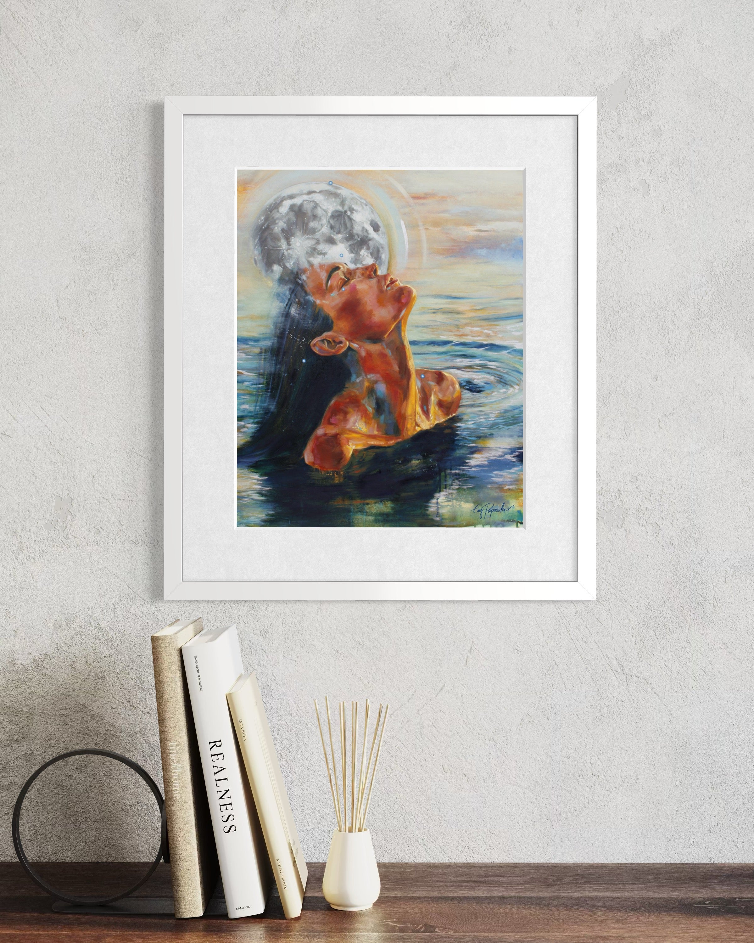 Dive into the rarified waters of Cancer, a fine art print on museum-quality paper that nourishes like an embrace and protects in the challenges. The moon is the light shining in the dark, the constellation of Cancer glowing steadfast over all she does.