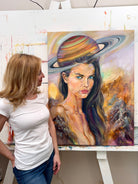 Step into the great strength of Capricorn, a one-of-a-kind original oil painting that embodies power, endurance and feminine precision. Guided by Saturn's deep vision for the future, this captivating piece features the constellation of Capricorn glimmering throughout the composition.