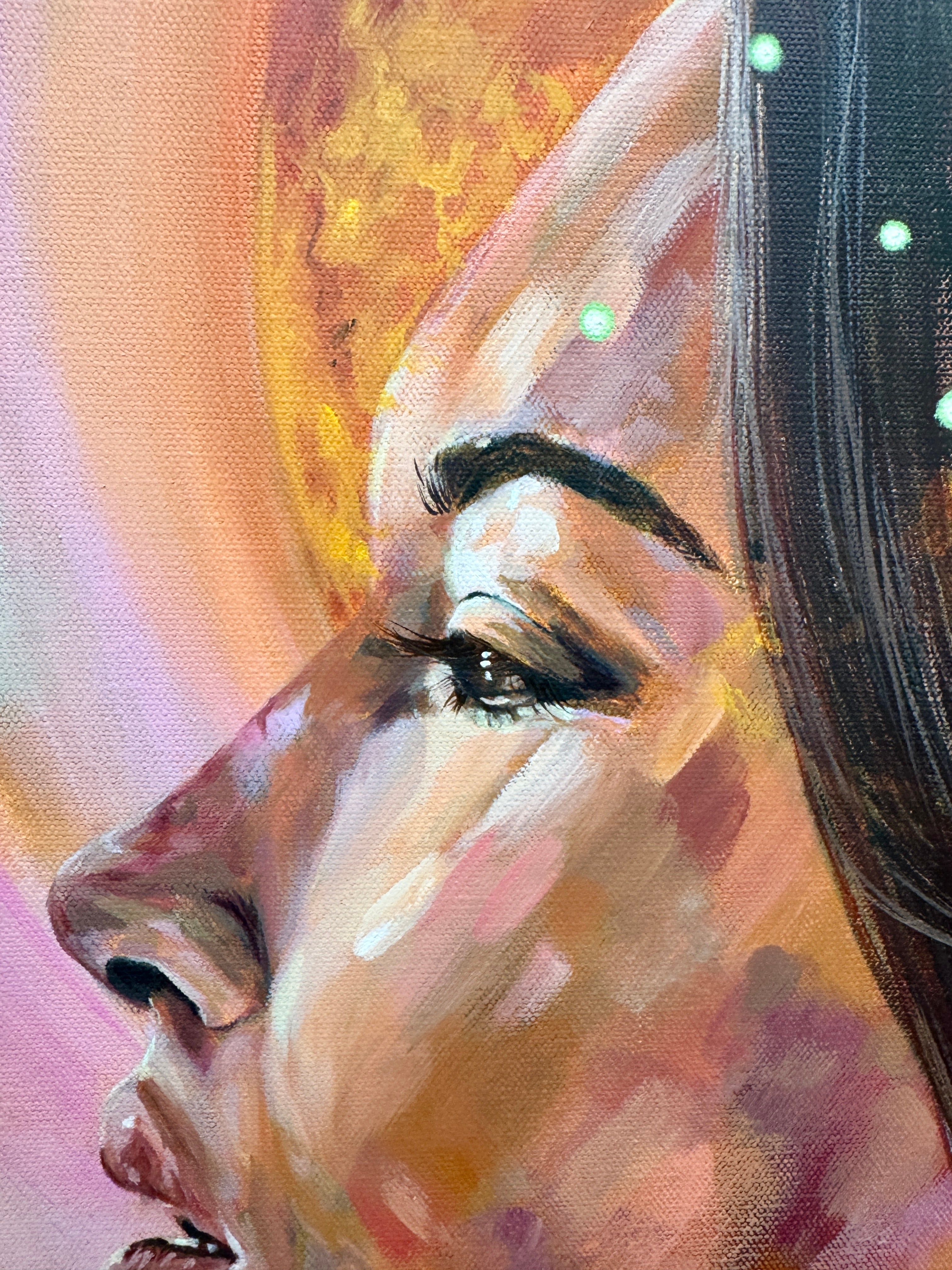 Immerse yourself in the magnetic allure of Taurus, a one-of-a-kind original oil painting that radiates a warmth that envelops depths often untouched. Venus emanates idealism into all she does, while the constellation of Taurus beams its strength of will and determination throughout.